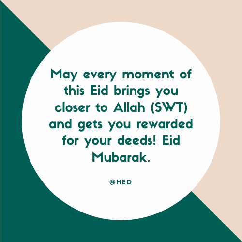 May every moment of this Eid brings you closer to Allah (SWT) and gets you rewarded for your deeds! Eid Mubarak.